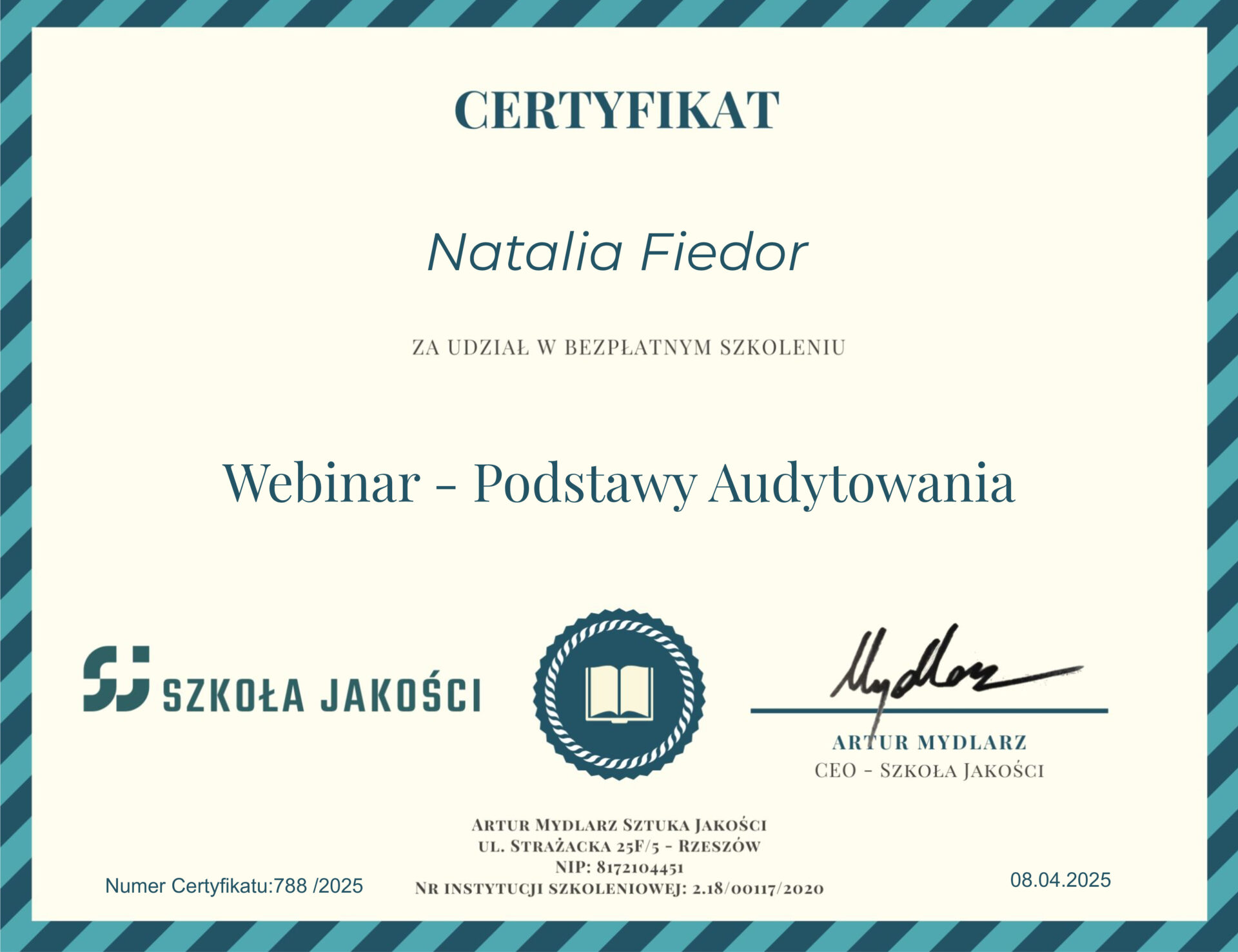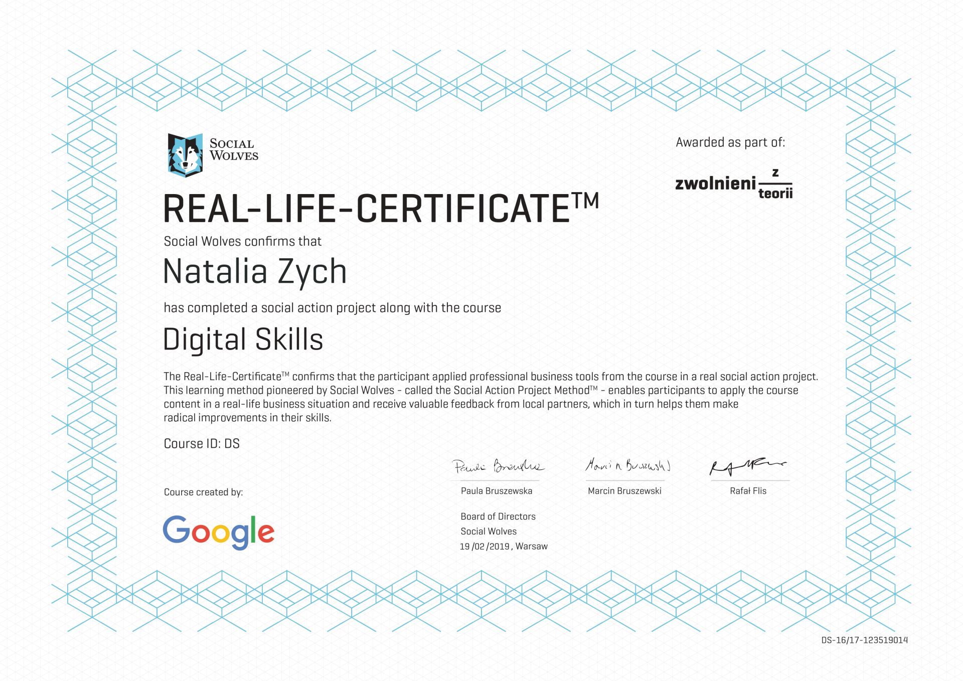 W trakcie studiów zaangażowałam się w projekt społeczny Zwolnionych z Teorii pt. „Nie bądź Januszem za granicą”, za który całym zespołem otrzymałyśmy imienne certyfikaty „Digital skills” oraz „Projekt Management Principles”.